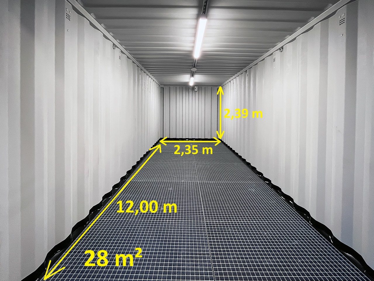 Laokonteineri mõõdud: Pikkus: 12,00 m Laius: 2,35 m Kõrgus: 2,39 m Pindala: 28,00 m²